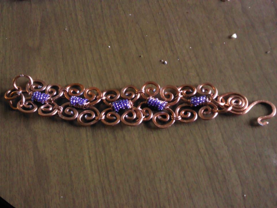 I really like working with copper wire! This is a spiraled bracelet constructed in five different pieces. These pieces are wrapped in bronze wire, and overlain by sparkly blue beads. The clasps are custom made to fit into a large jump ring. This piece is hammered for added durability.