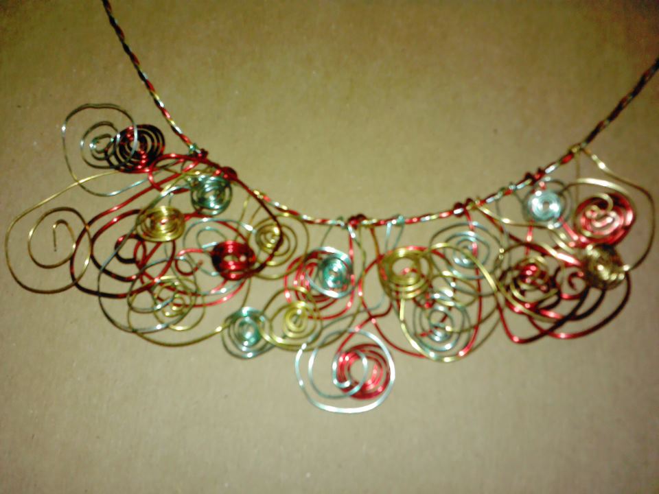 Wire Spirals Necklace January 26, 2013 · by dirtartful · in Jewelry. · This design features yellow, turquoise, and red 24 gauge wire. The necklace portion is the three different colors spun together, and shorter wires are attached to the center and spiraled into overlaying spirals. It took about an hour to make. Share this: Click to email a link to a friend (Opens in new window) Email Click to share on X (Opens in new window) X Click to share on Facebook (Opens in new window) Facebook Click to share on Pinterest (Opens in new window) Pinterest Like Loading... Related