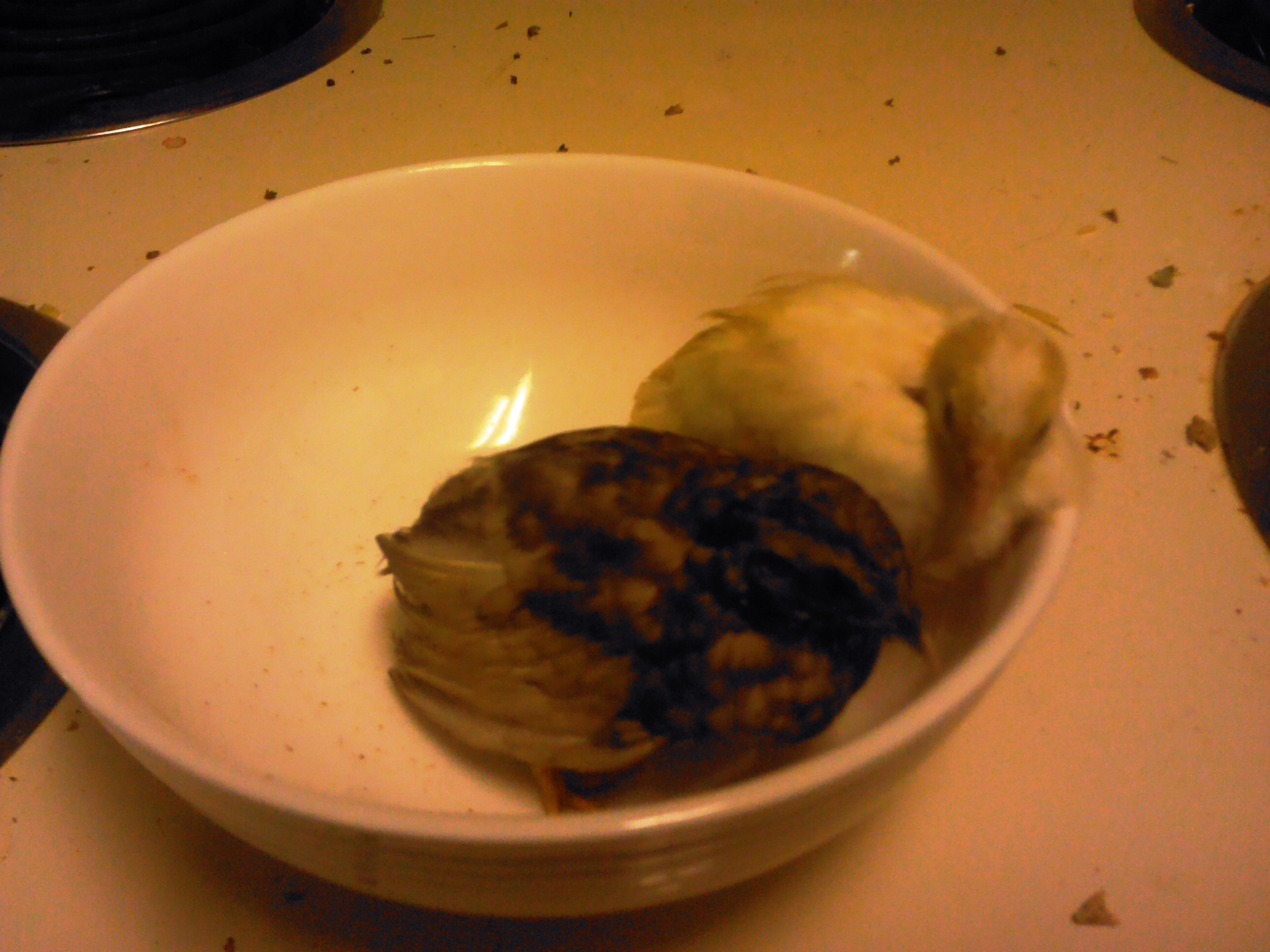 The ducklings are by far my favorite creatures that I have ever had. I knew they wouldn’t be around long. I killed the largest 6 (all over a pound), and let some of the smaller ones bulk up a bit for the week. Holy crap, they are loud! They also love to swim in their water dish, spilling it EVERYWHERE! So, I caved in and let them hang out in my bathtub in a tub of water. By Thursday; however, the noise was just too much, and the rest of them were culled. This was, by far, the hardest thing that I have ever had to do. Ducks are super intelligent comedians. They have quizzical, adorable expressions. They greeted me when I came in, and they are afraid of the dark.