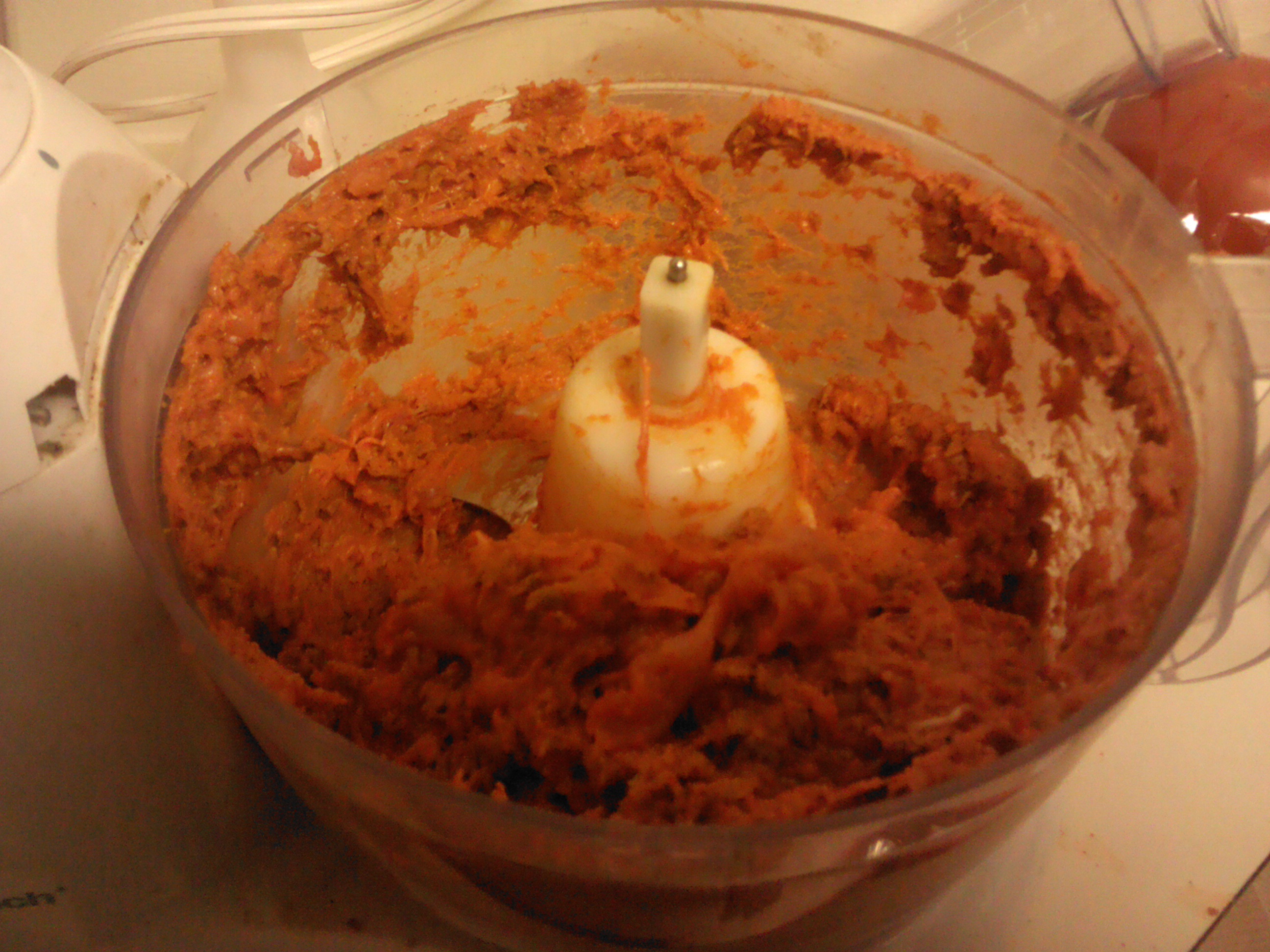 I made sure that it was in chunks no larger than 3/4″. Before putting them in the food processor, I put them in the freezer for 20 minutes (to make it easier for the blades to grip).