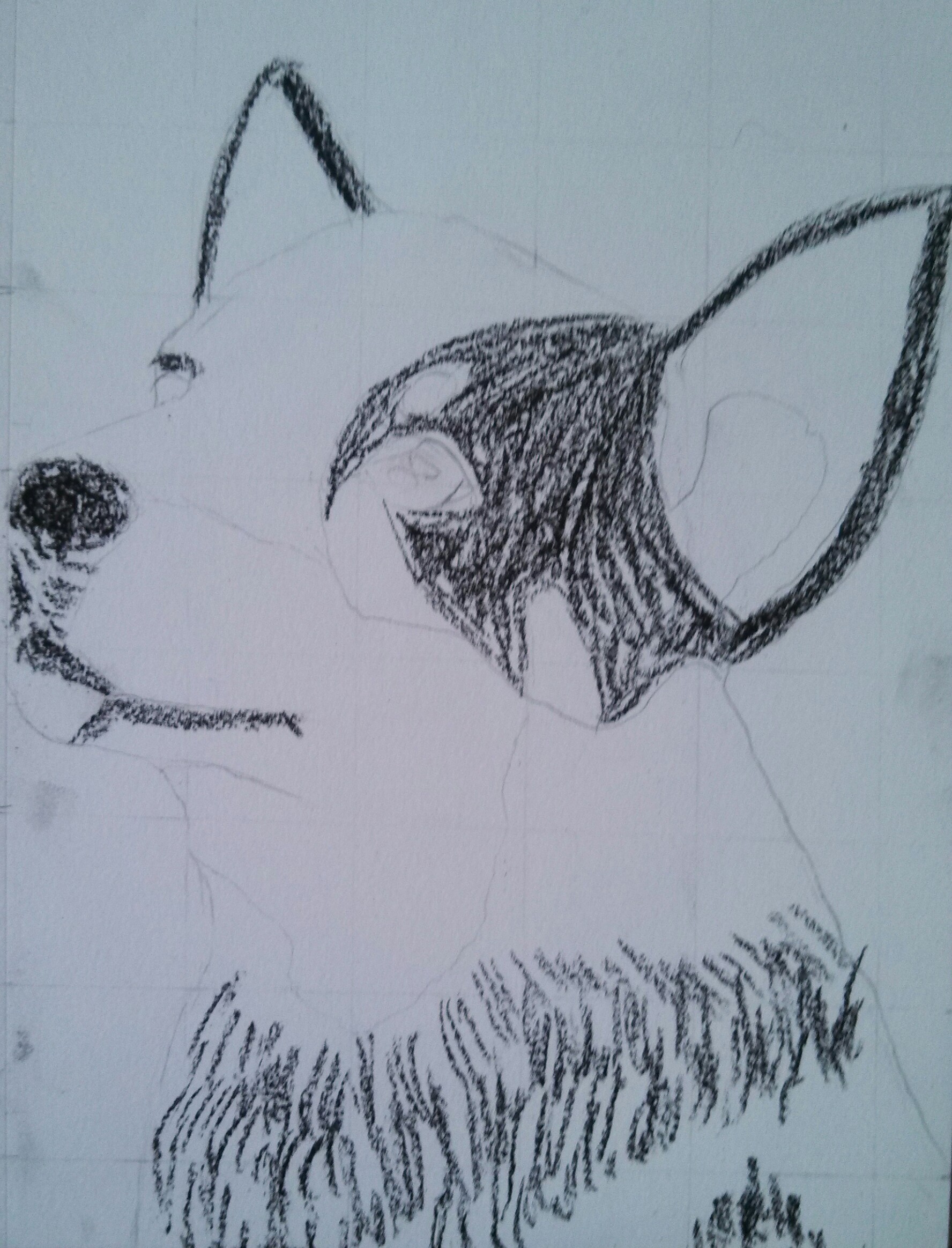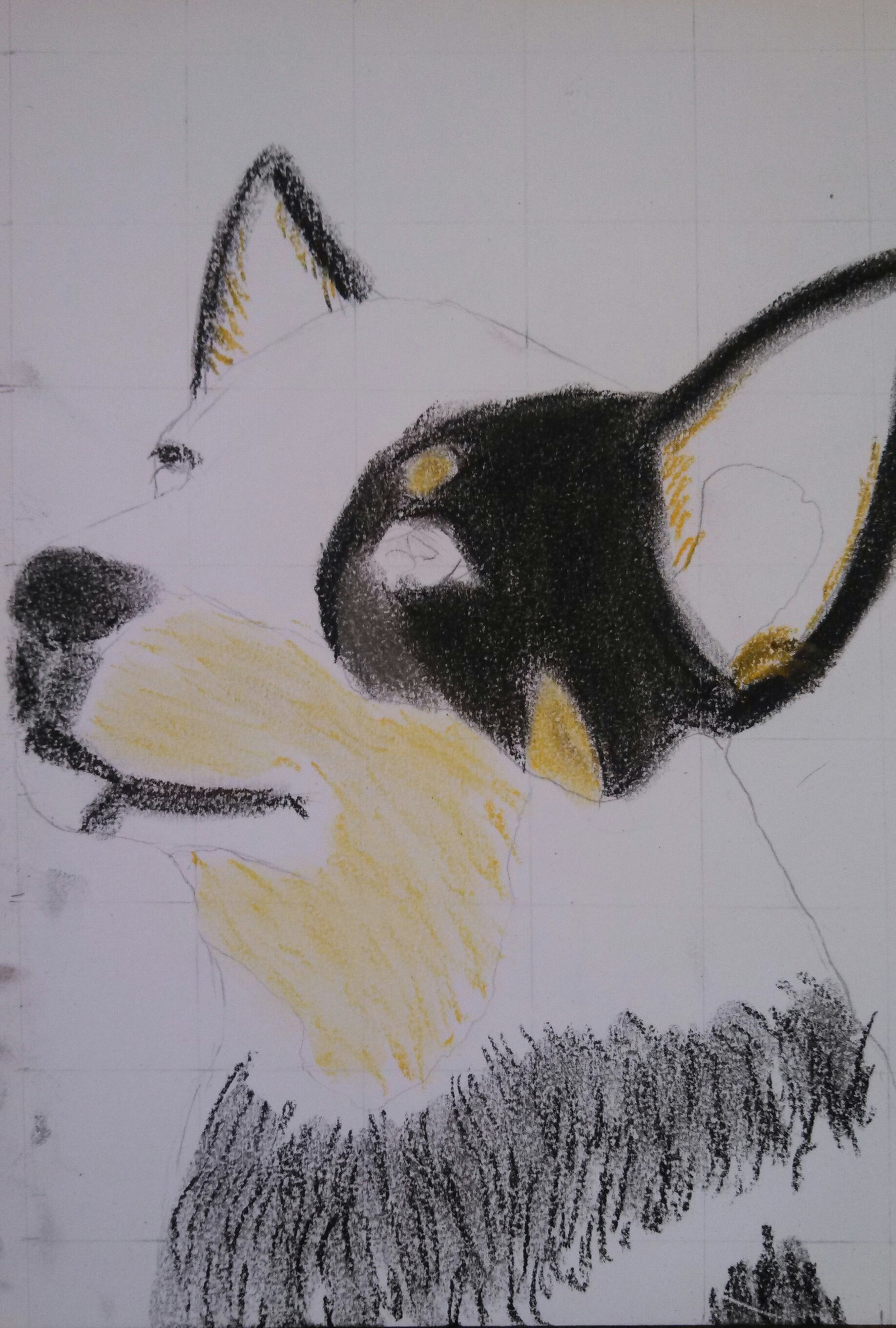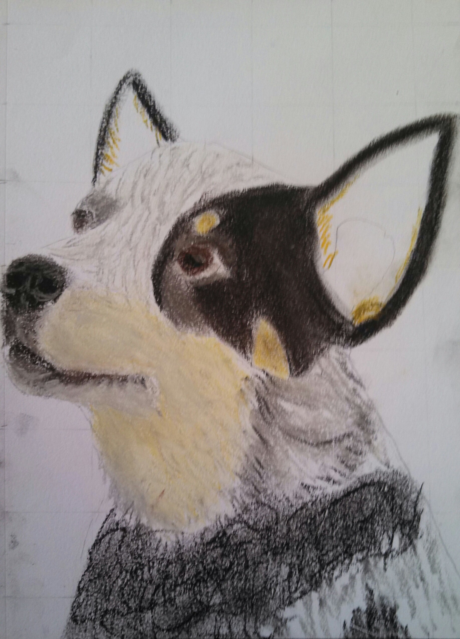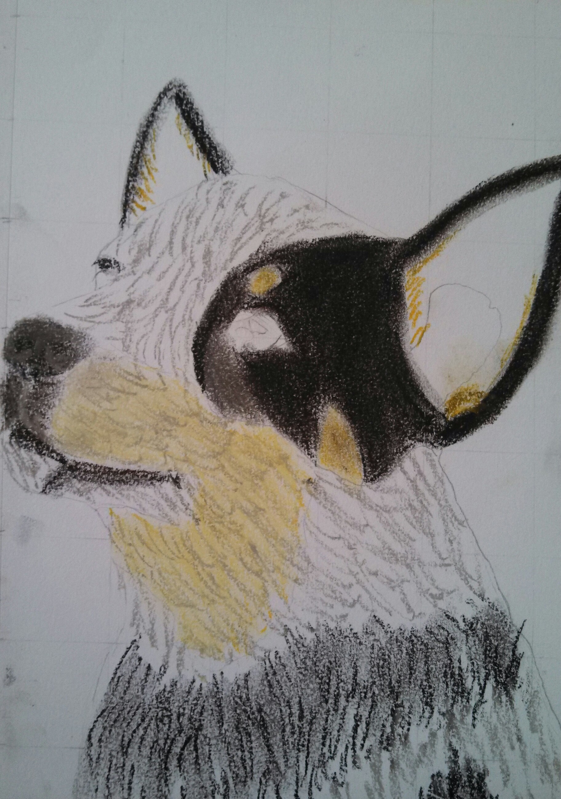 The particular cattle dog that I was studying had an undertone of orange/tan around the muzzle, and in its raccoon mask. So, light chalk markings are added around the muzzle.