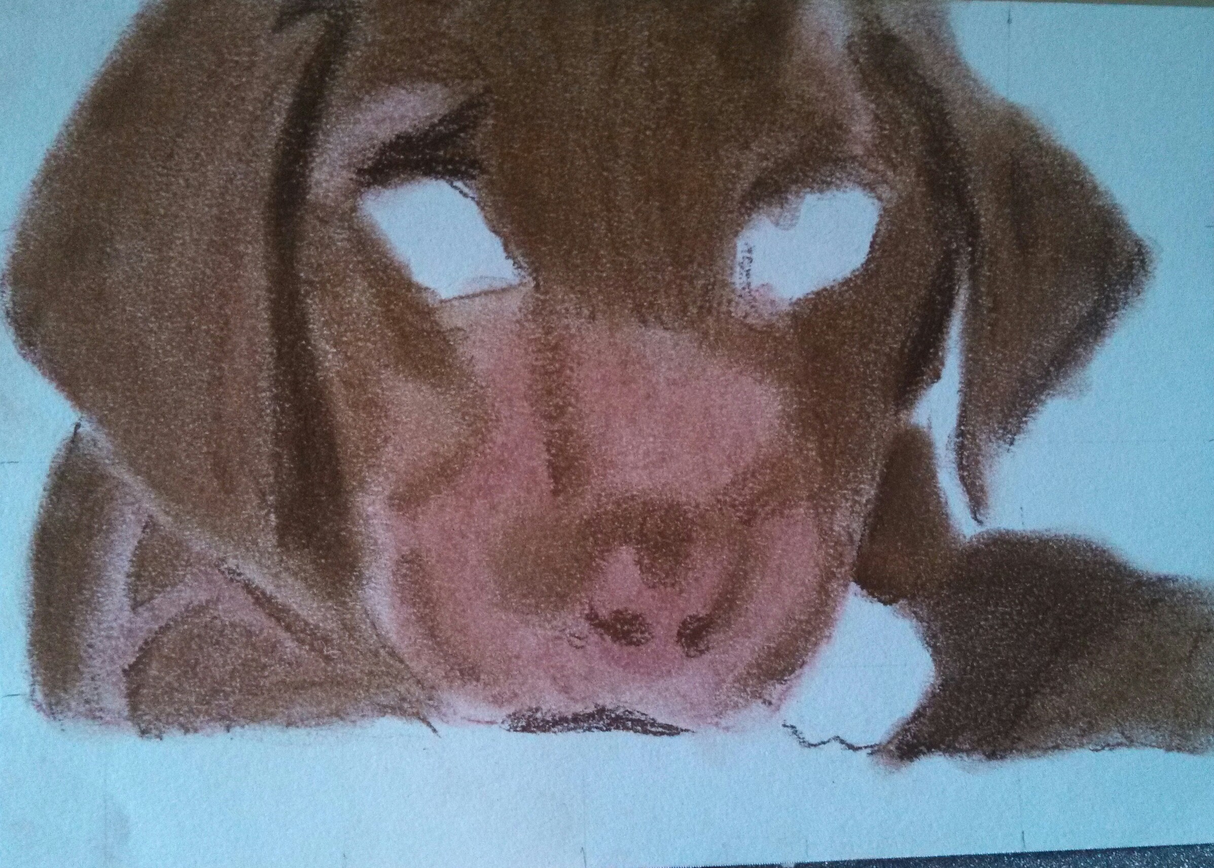 After drawing a pencil outline, I went through with a reddish brown (the color Clark is) for the base colors for the lighter area, and a light brown as a base color for the dark parts of the dogs face.