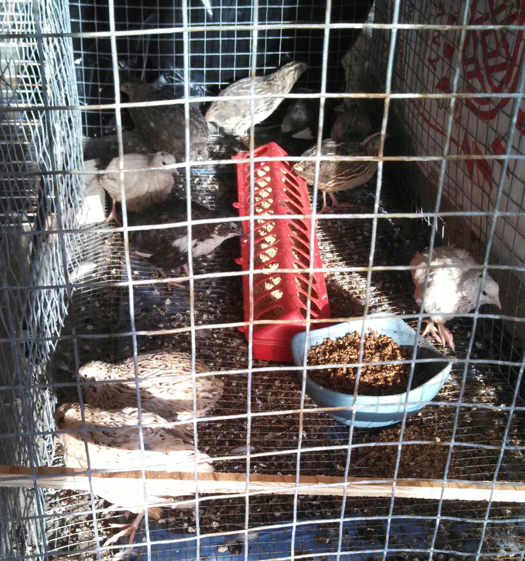 Last Sunday, we went back to the auction and picked up 11 quail (Coturnix). There were three males, and 8 females (I THINK, I can’t vent sex for the life of me). There are blondes, Texas A & M quail, traditional brown, and ones that look like tuxedo quail. They weigh, on average, of 0.4 lbs. Currently they are housed in a 4′ x 2′ wire enclosure on the floor of our car port. They have enough space per bird (a little less than 0.75 square foot per bird), which will have to do for now, until I can find a bookshelf, or some pallets to re-purpose.