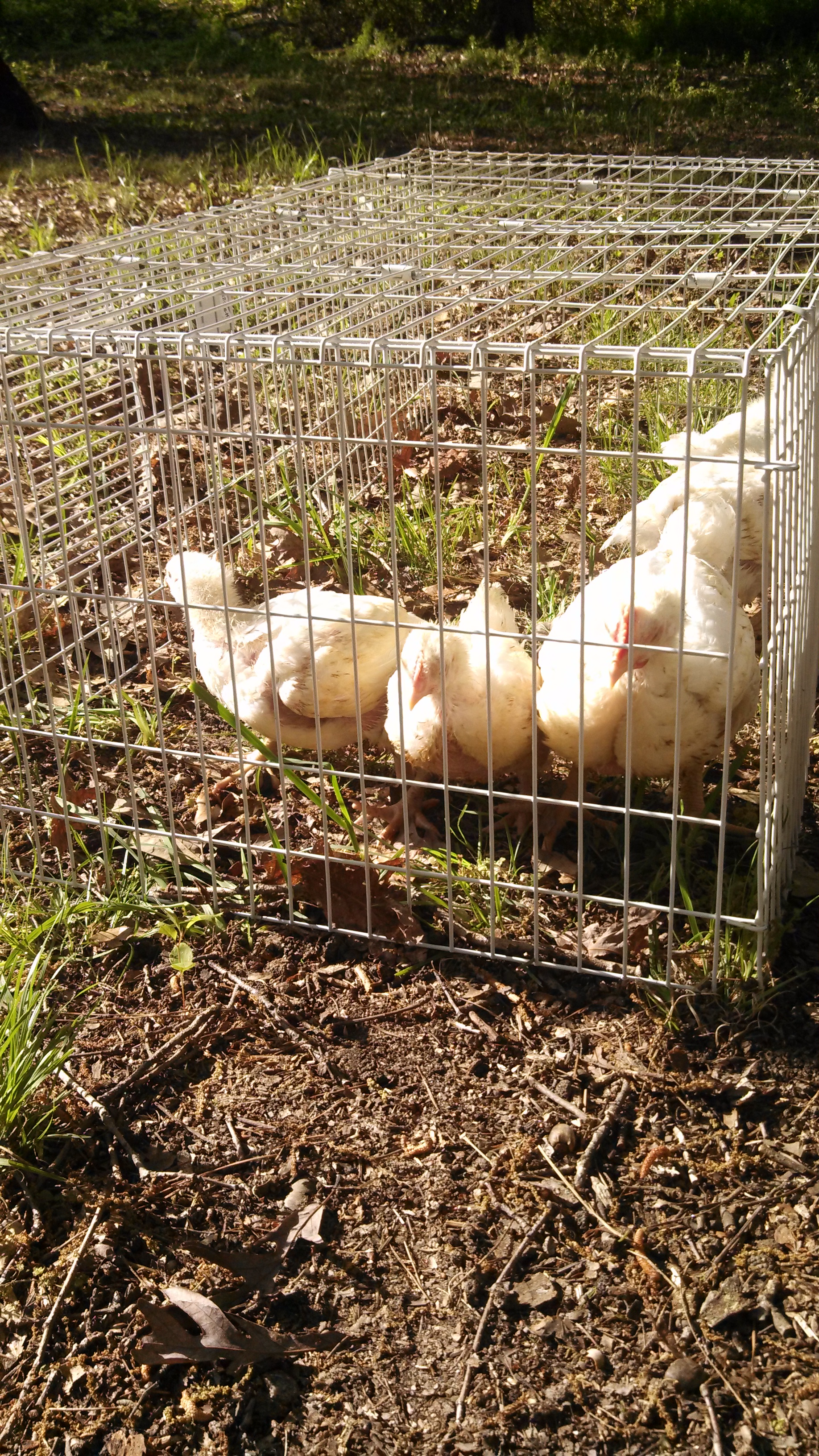 The broiler chicks have definitely proved that they can put on crazy amounts of weight, doubling in size in both week two and week three. Though this is an impressive feat, I don’t want my chicks miserable, and breaking their legs because they get too fat too fast. So, they all go out in dry weather, with plenty of fresh water, so they can get some exercise and act like a chicken (and yes, it IS a guinea pig cage). It took them about three days to figure out “hey, this isn’t so bad”. After a few hours, some food is brought to them, so they can eat. At night, they are brought back in, mostly because the cage isn’t secured from wily night predators.