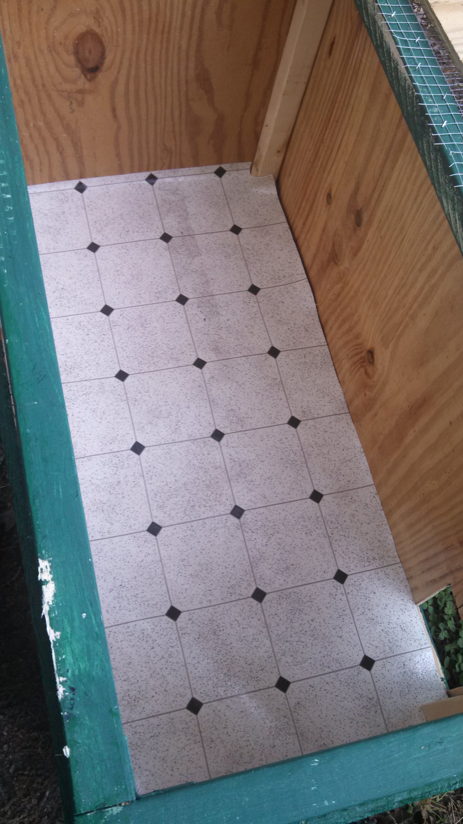 Inside of their house has a plywood floor, so I cut up a sheet of linoleum flooring (the cheap kind), and placed it on the floor over the sawdust, to make for easy clean up.