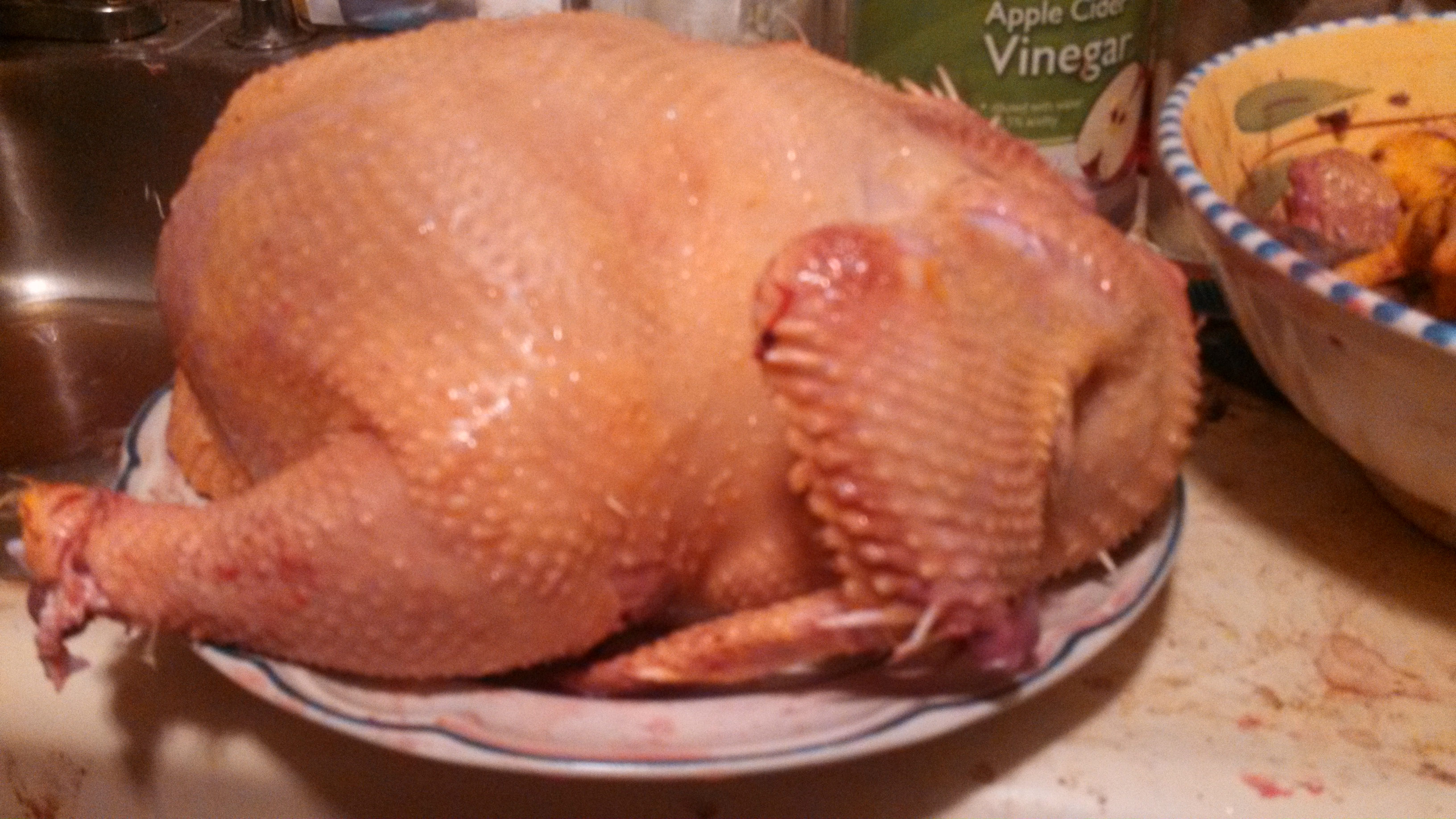Well, it was time to butcher the monster chicken. He weighed in at a hefty 8.72 lbs (which was a gain of nearly 1 lb), and even though they can get bigger, I wasn’t THAT curious. Nearly 9 lbs in 7 weeks was totally enough for me. He dressed out at 6.15 lbs, for a total of a 71% efficiency. This bird alone led to 13 meals for all of my dogs… (with the four of the free rabbits dressed to equal 34 additional dog meals, I am set for a bit).