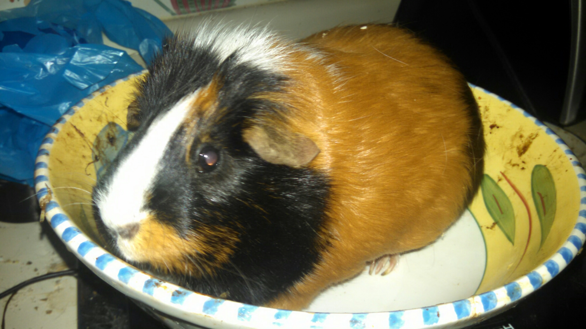 Malt is six years old, and weighs 2.14 lbs. She has a chocolate middle section, and black pants. I took the breeding boar Silkie out of the long pen, and put him in with the other new girl, Biscuit. Then, I put Malt in the long pen.