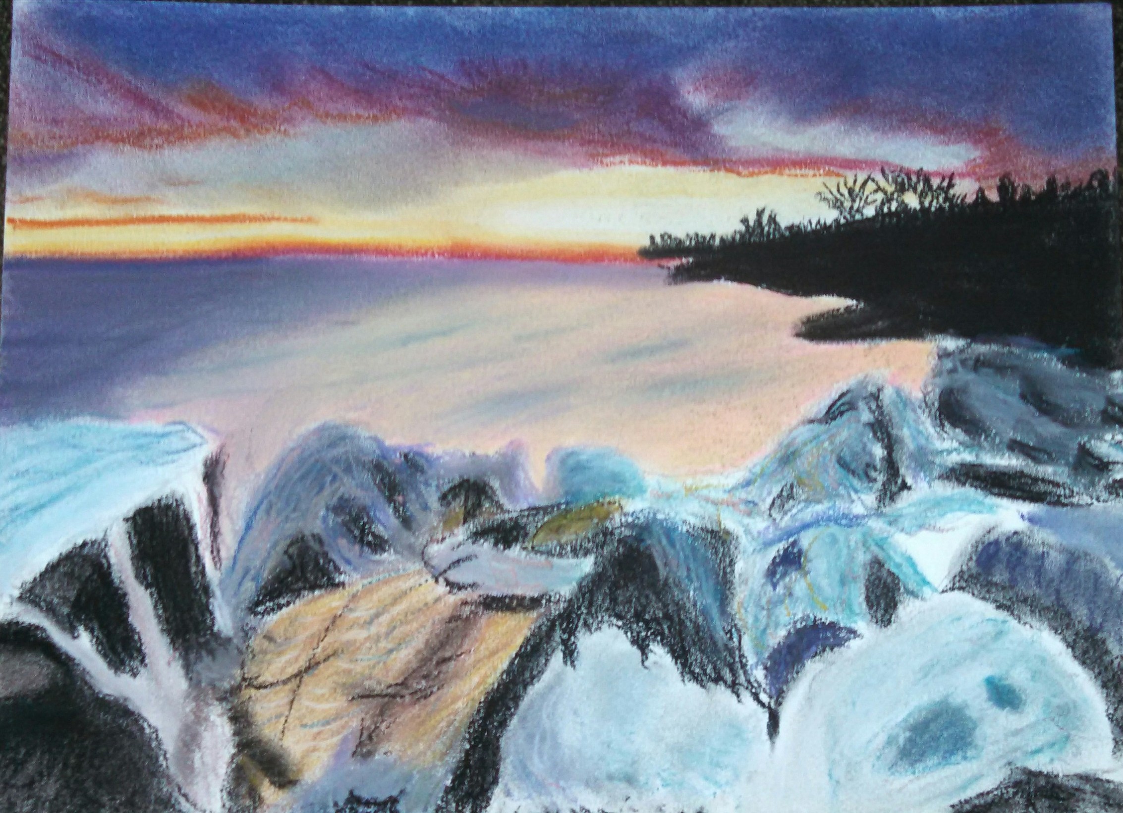 I really love this one! It is early morning in early spring on Lake Superior, with the rocks glazed over in ice. The brilliant sunset lights some of the ice with a fiery color, and gives the water a unique glow.