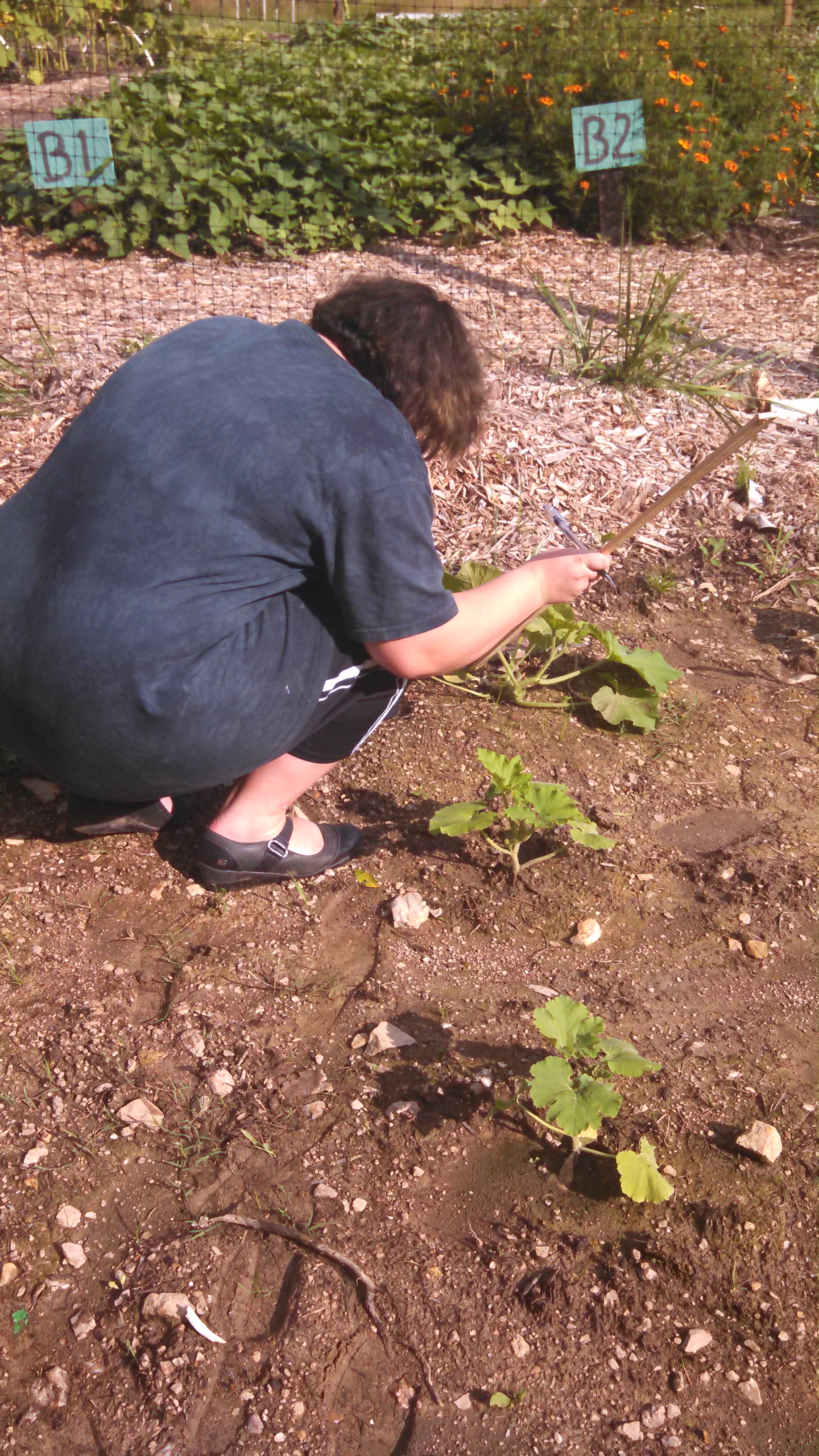 So, on Wednesday night, Bella and I went out to fertilize pumpkins and measure their heights.