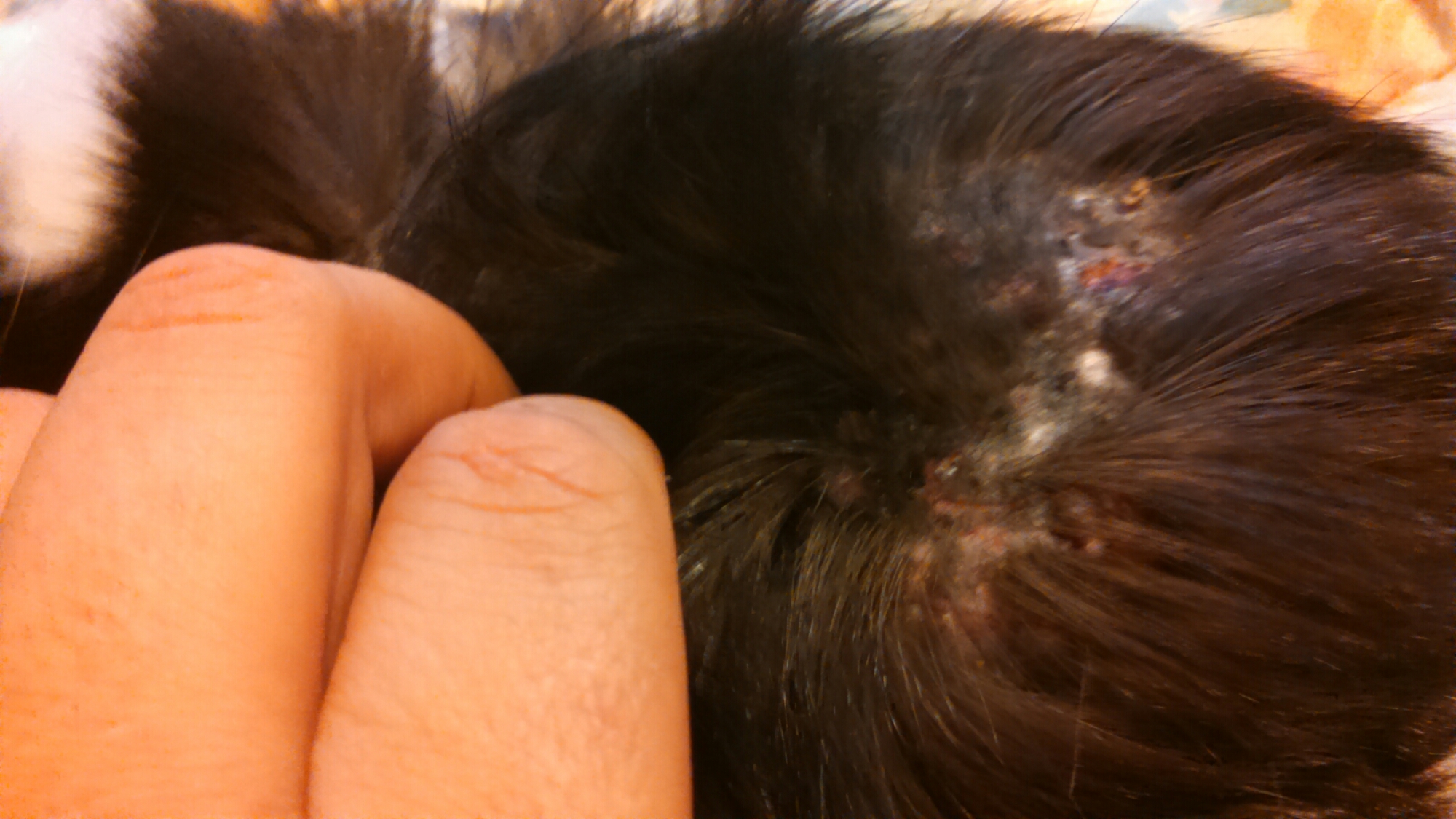 Anyways, Ron and Fluffy have been coexisting in peace for over a month. This week, I happen to go outside and see that Fluffy looks like he got beat to hell! Several superficial wounds and some missing hair chunks.