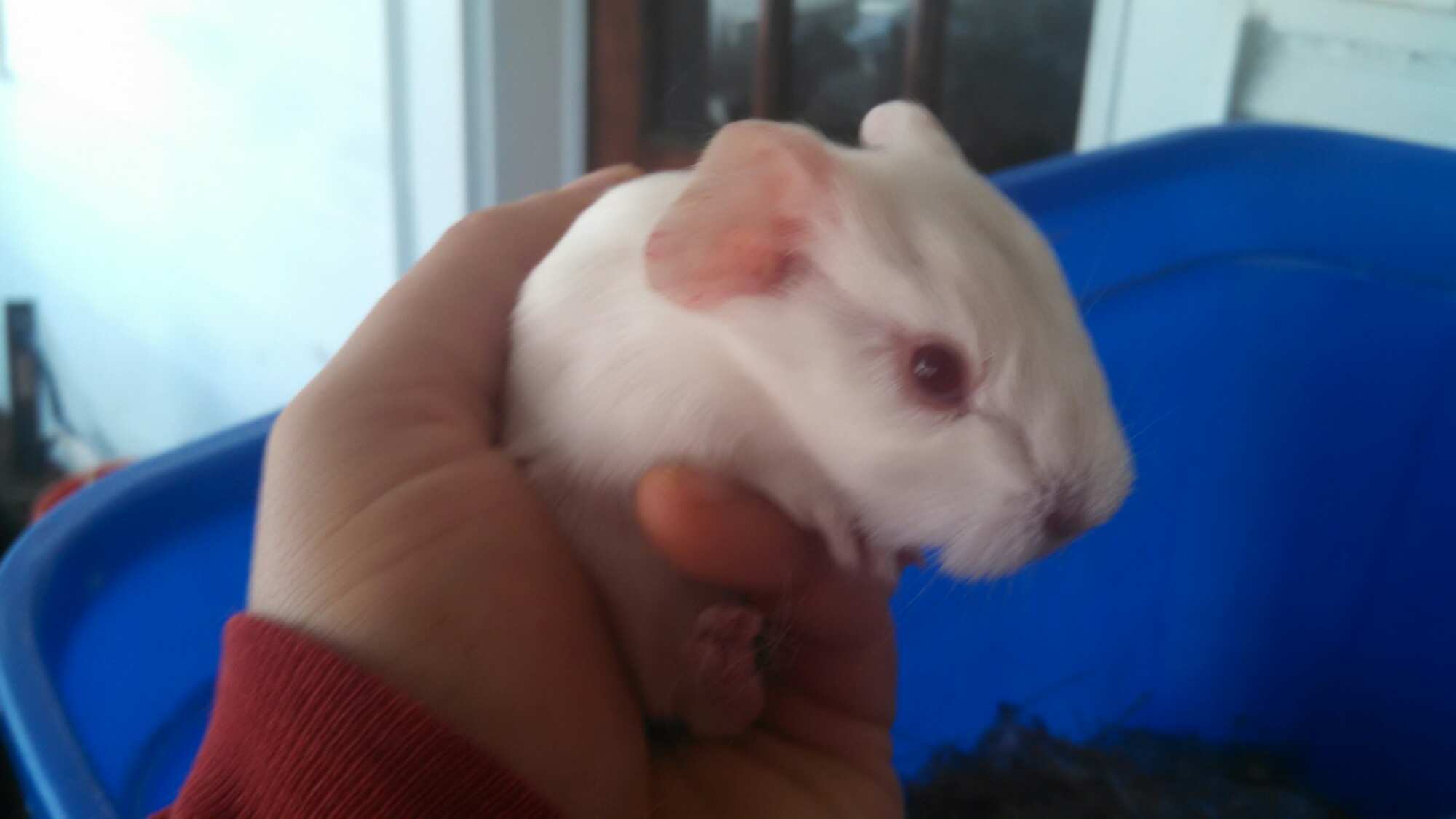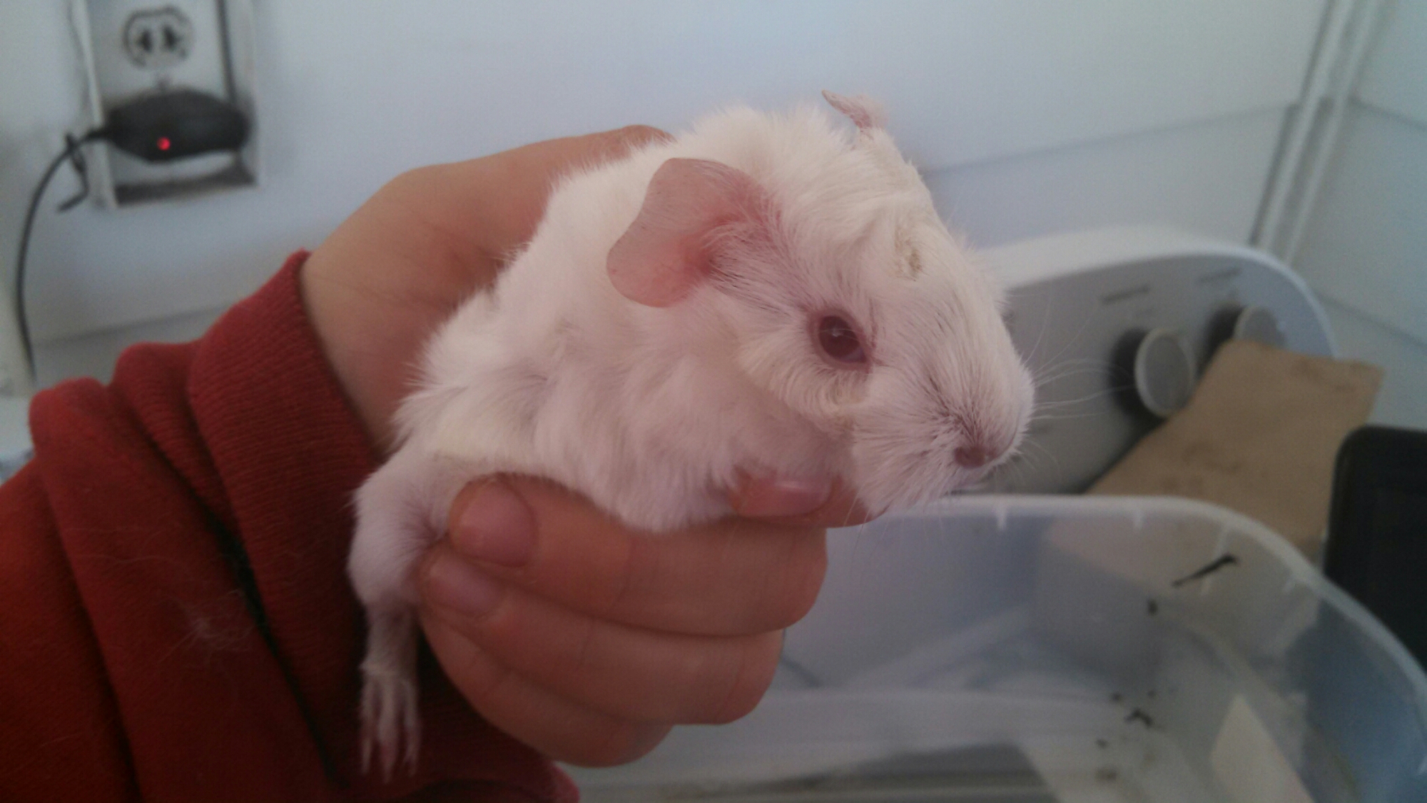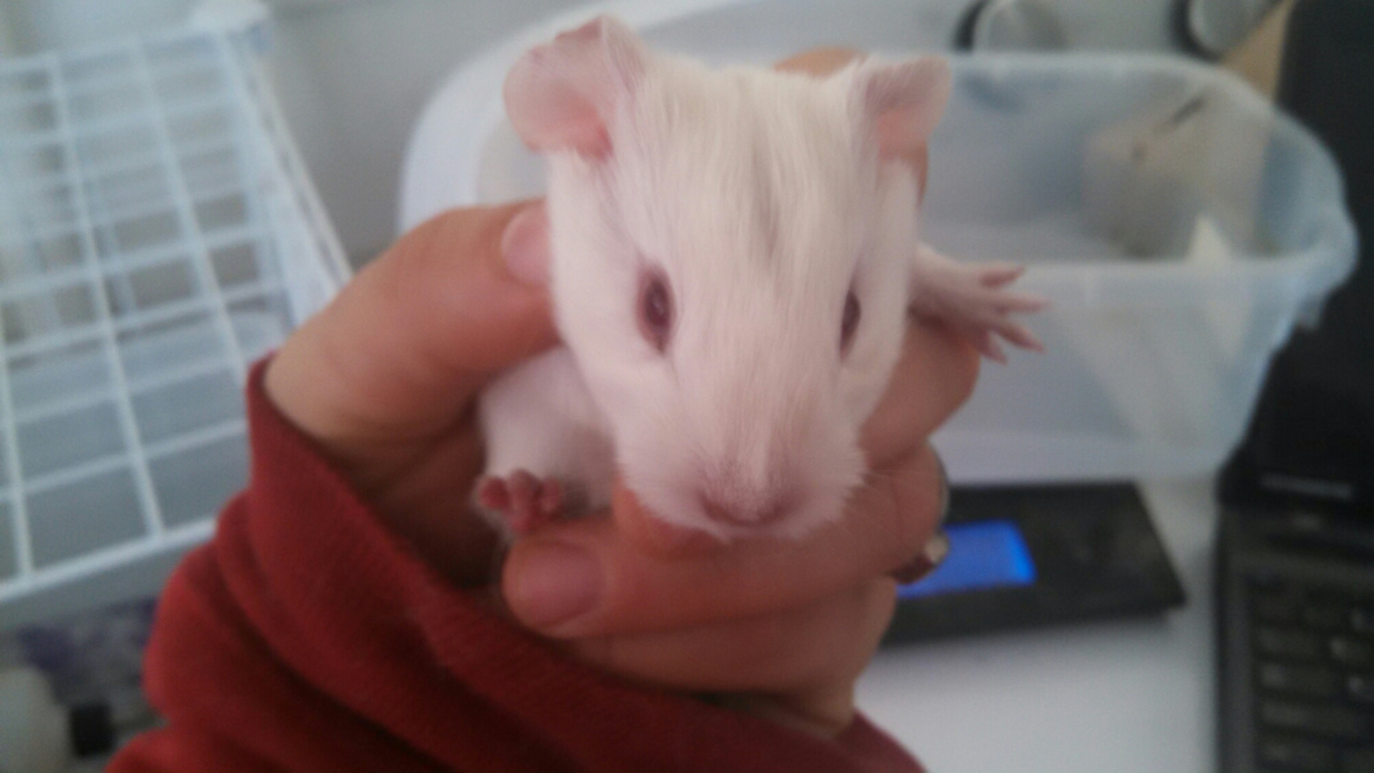 Well, a few weeks ago, there was an entire litter that I attributed to Abby (my white Abyssinian sow). Well it turns out that she was still super fat, and I thought that she hadn’t lost her baby weight. Until I went out this morning, and found a skinnier Abby, and three little white babies huddled in the shelter. Like the previous white litter, there are two smooth whites, and a Fluffy white. They all average around 0.2 lbs, and were born 12/26/14.