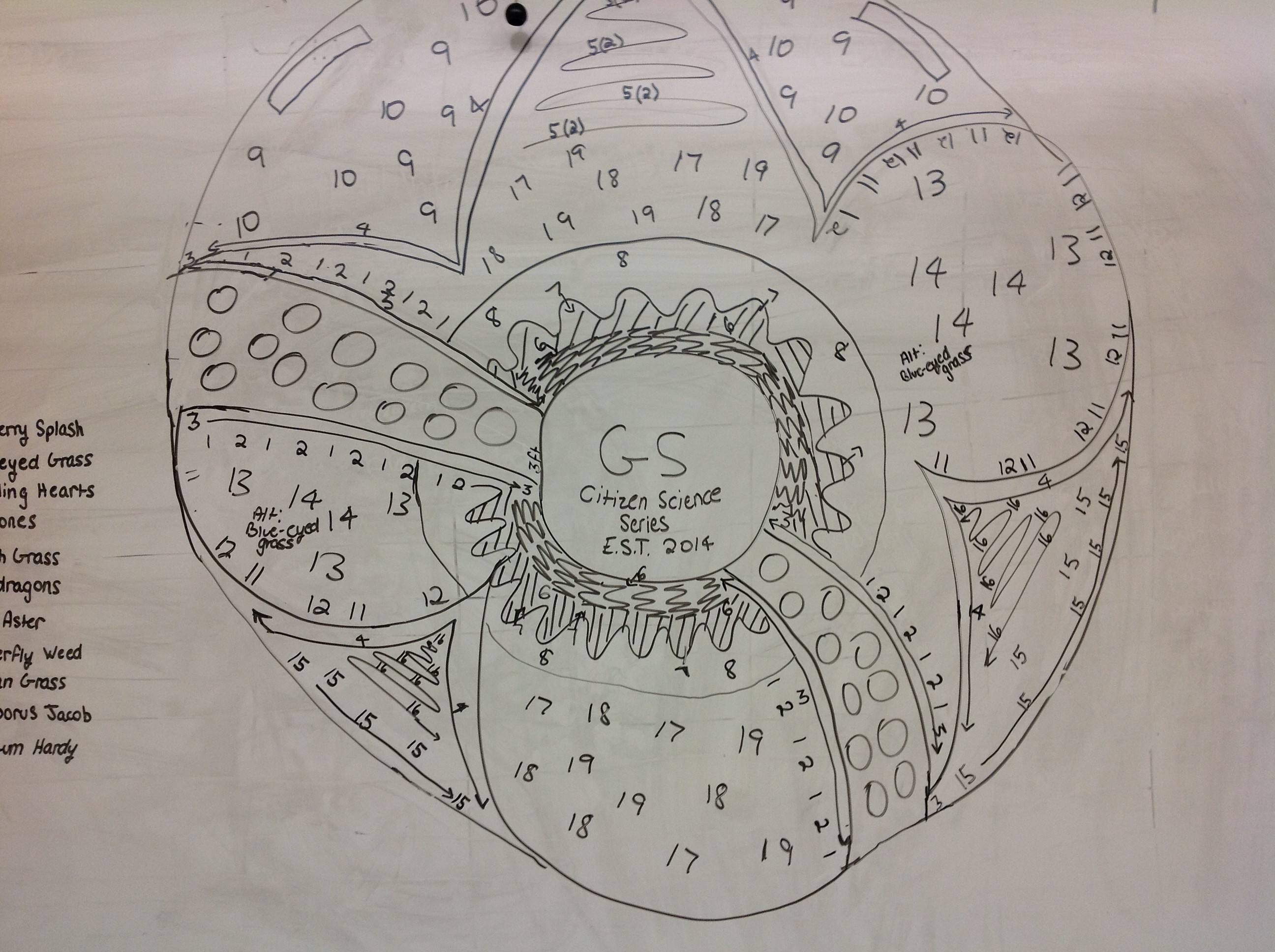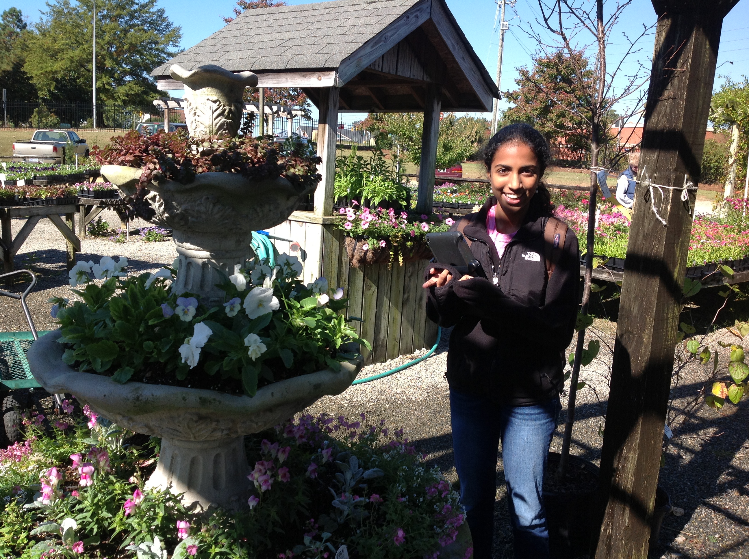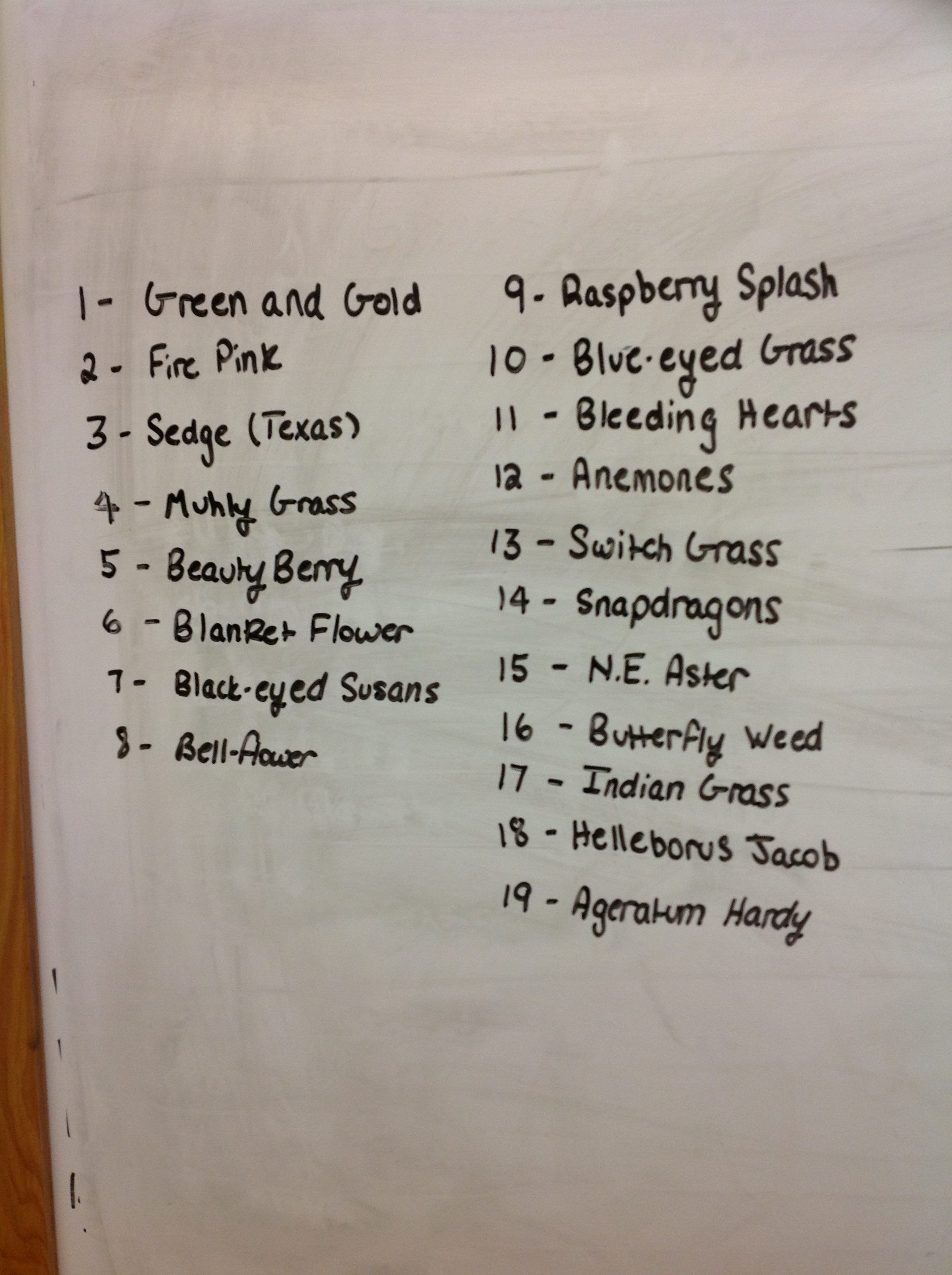 Well, I am like over a year behind on the writing of this blog (life is busy, and actually running my programs take precedent to writing about them.) I will take you back to October 26th, 2013. This is the final weekend for the raingarden planning, and the official Citizen Science overnight. It is time for us to put on the final touches for the rain garden site planned out in Week 4. But what to plant? First, we went on a field trip to a nursery to search for some potential plants that are local to the area, making sure that the garden has color and balance the entire year. We also need plants that don’t mind being in partial sun/partial shade, and can tolerate wet roots.