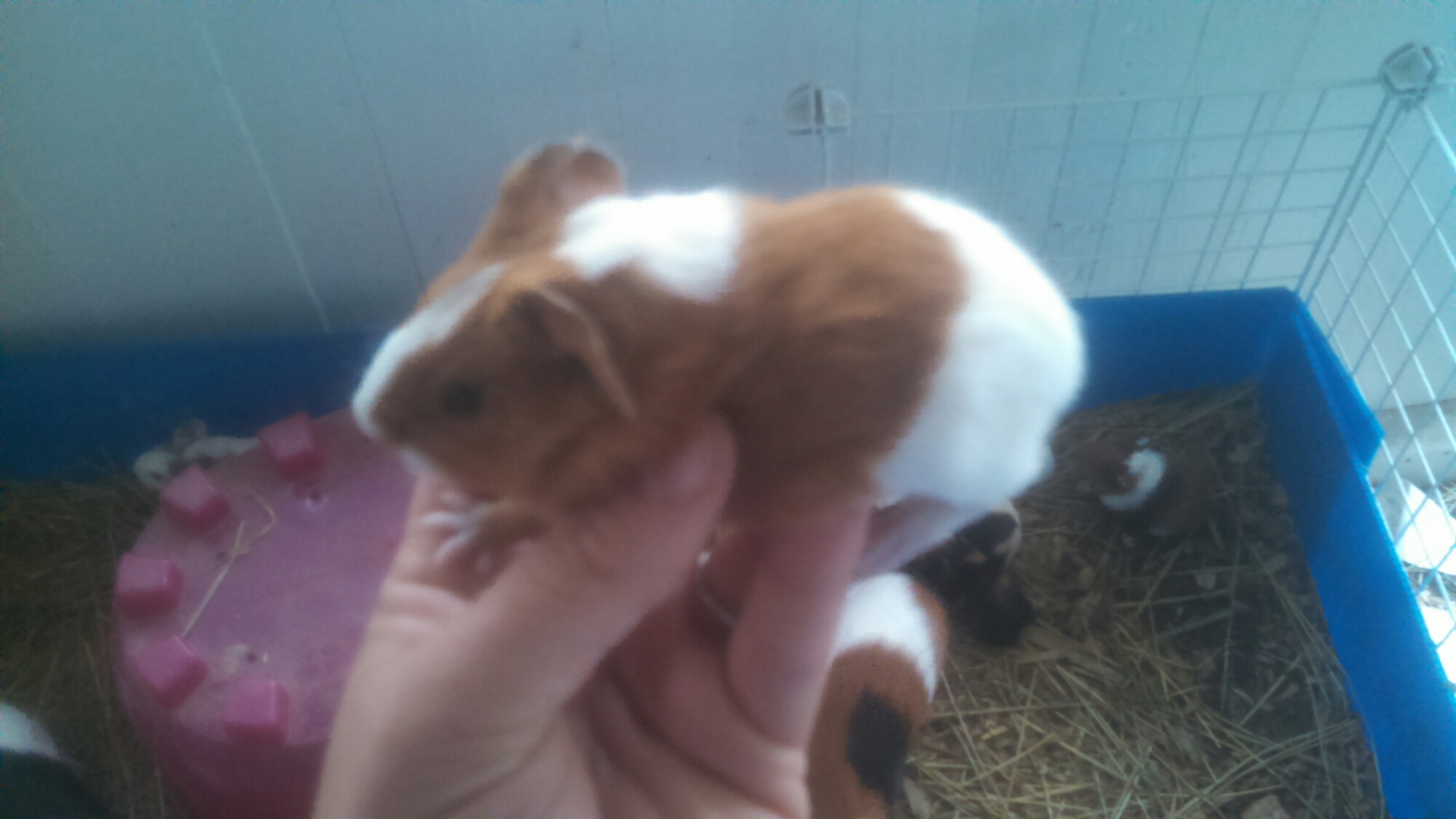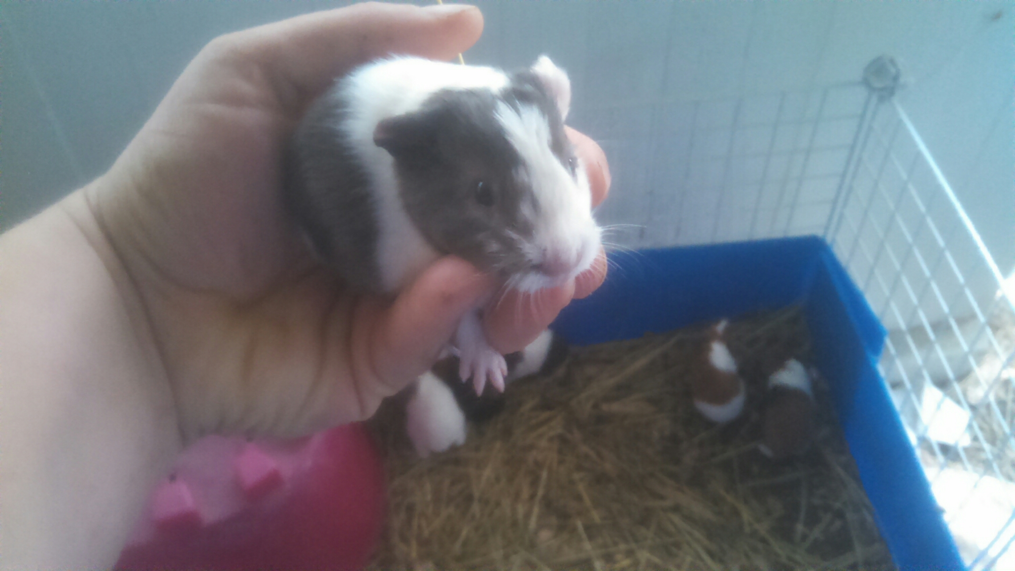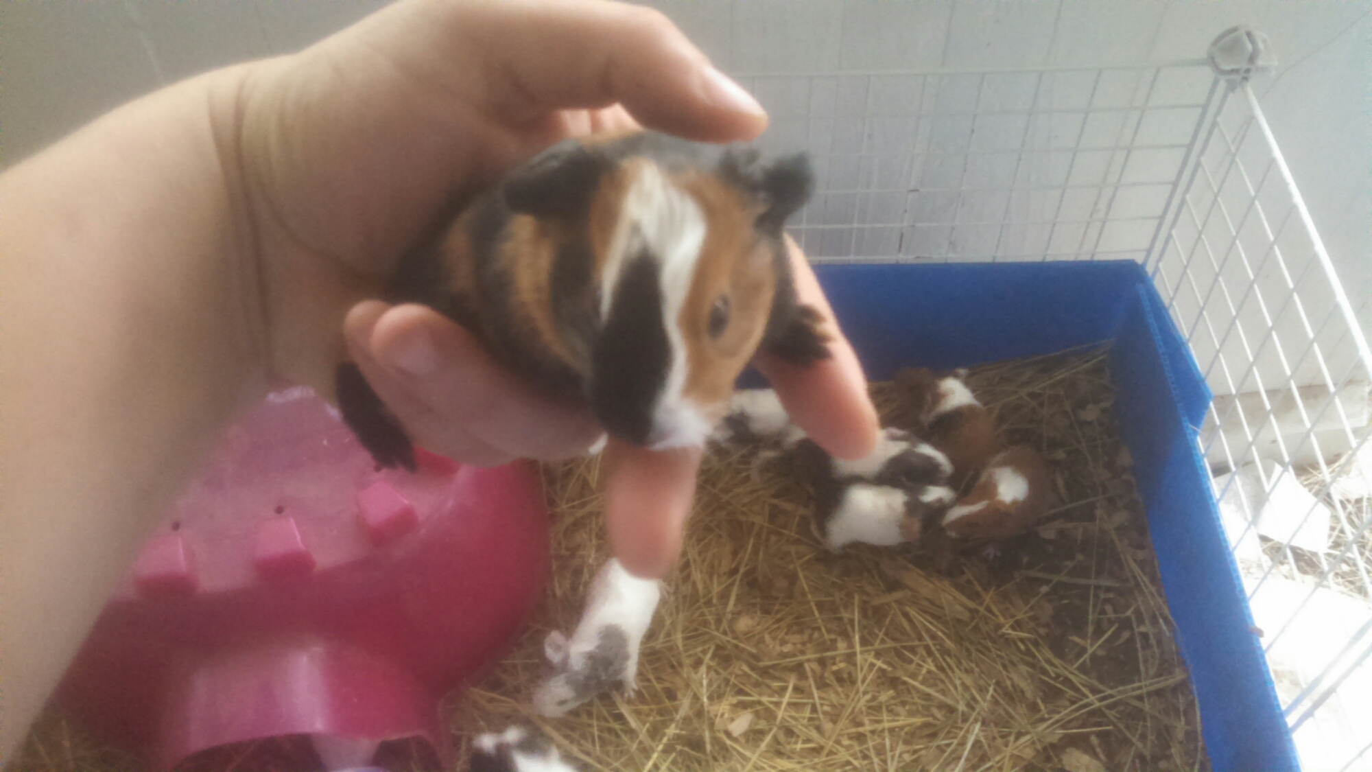 But, by far my favorite baby is a black, orange, and white baby. The face blaze is actually white, with a black splotch. The body has a lot of black, with orange stripes. All are healthy.