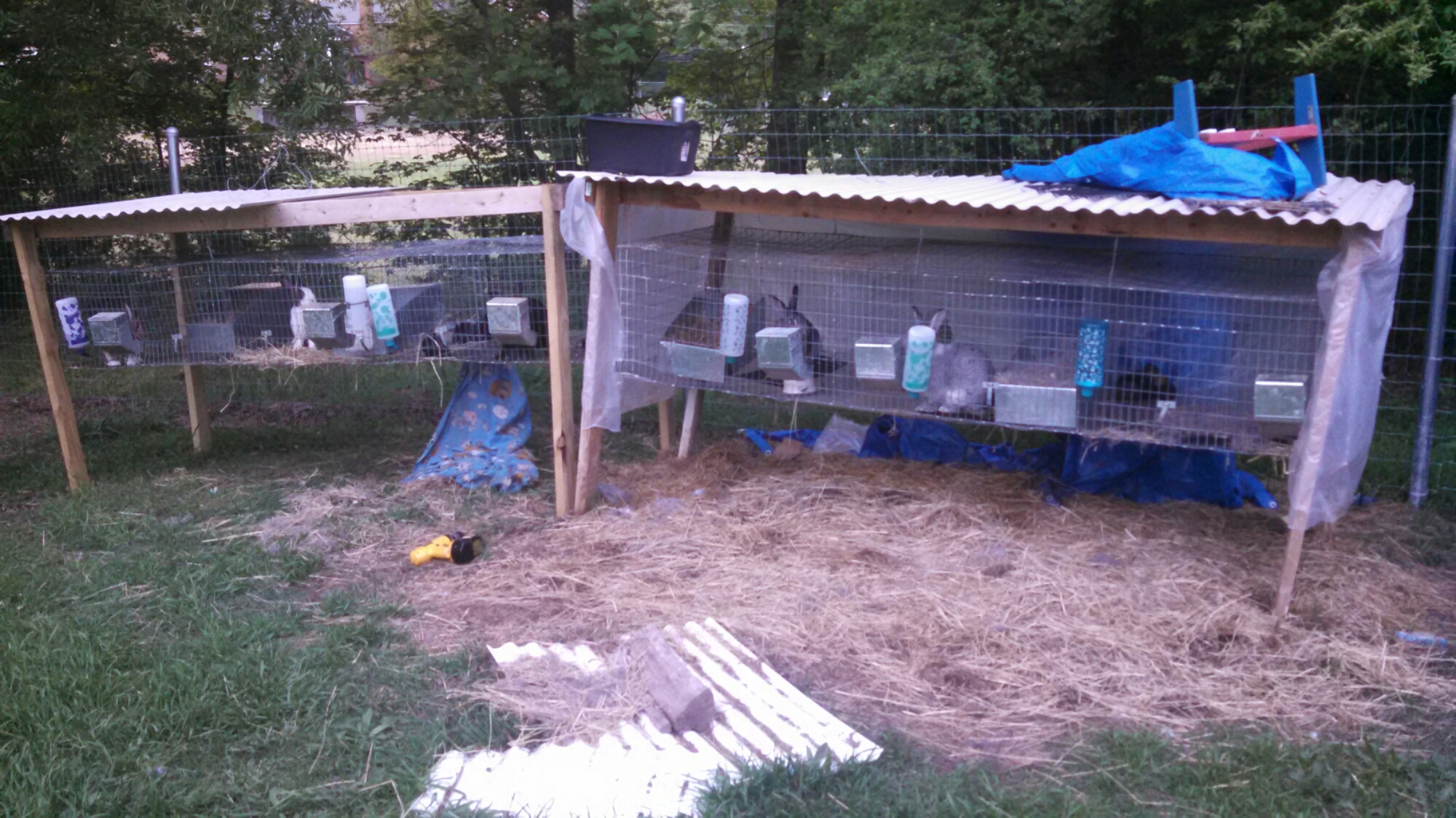I managed to get the second set of cages hung, with a nice shady overhang that keeps most rainwater out of the food. Syren’s kits kept hopping out of the nestbox after ten days, so I removed it this morning. Their eyes are open, and they are huge compared to my other litters. She is such a great mother. I will hopefully get to weigh everything soon.
