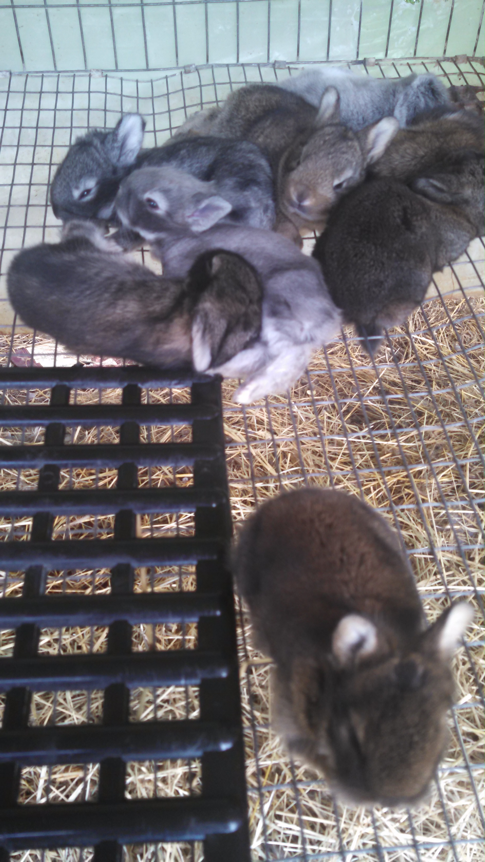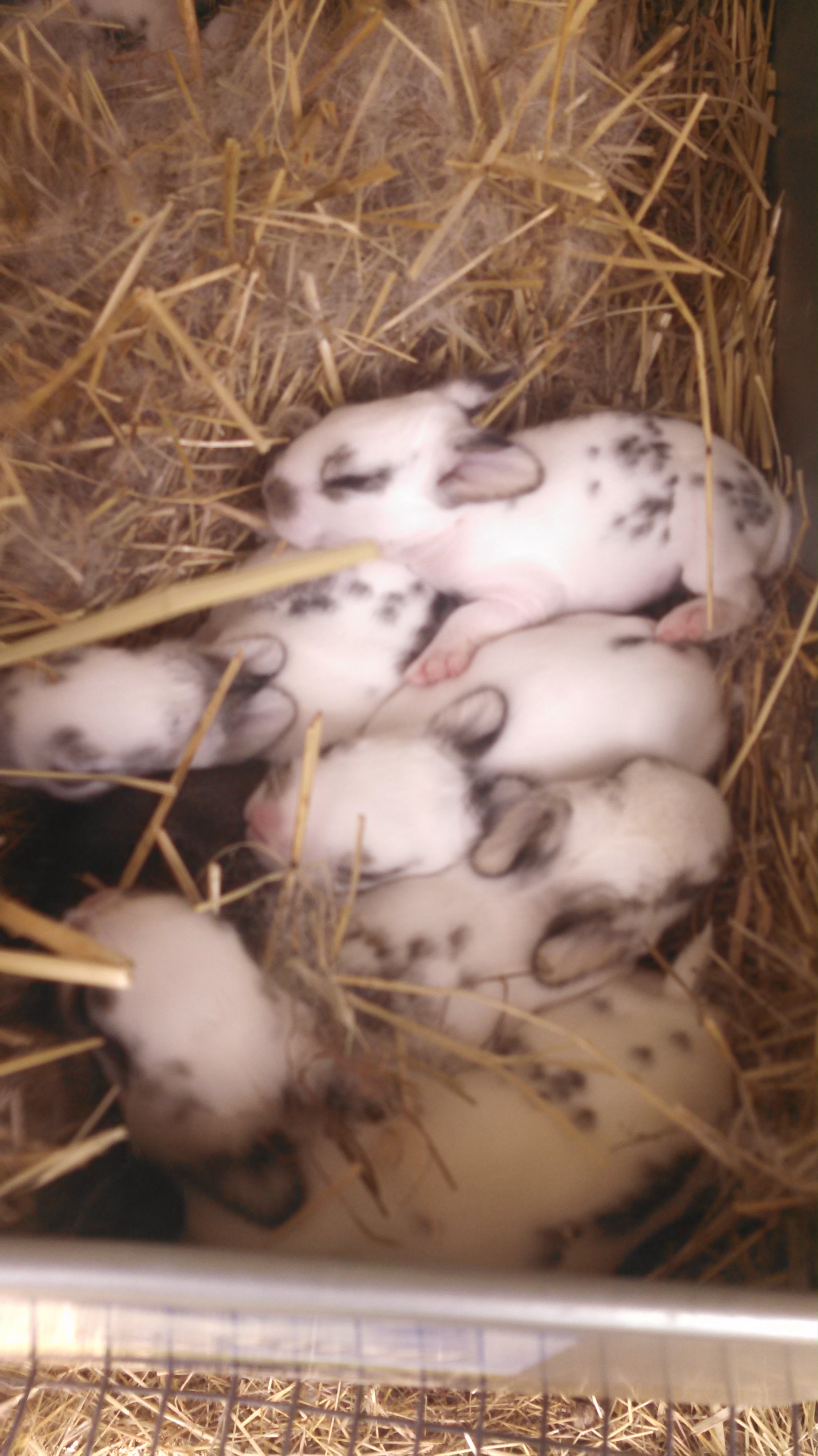 Fyre delivered nine kits on April 27, 2015. Six of these remain. We lost two of them to a freak accident this week… Trying to crawl through the cage into another rabbits cage.