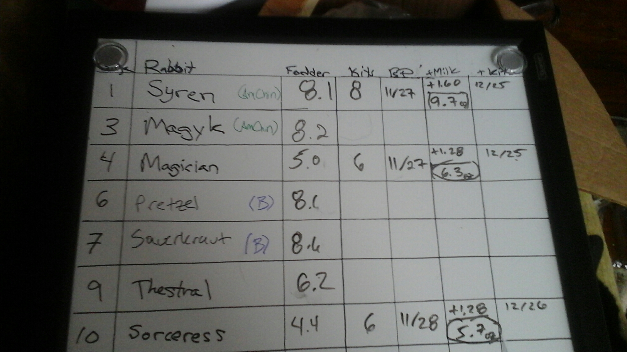 I have 17 does to keep track of. Feeding fodder isn’t difficult, but once litters are involved, fodder amounts vary based on the amount of babies in the litter, the age of the litter, and the weight of the mother. So, it was about time for me to actually write out a grid on the base level of fodder (which is 6% of rabbits weight), litter size (which determines the extra fodder for the milking doe), and after 4 Weeks of age, the supplemental feed for the weaned kits. I went based on a fodder chart from another rabbit raiser. I will let you all know how raising does on fodder goes….