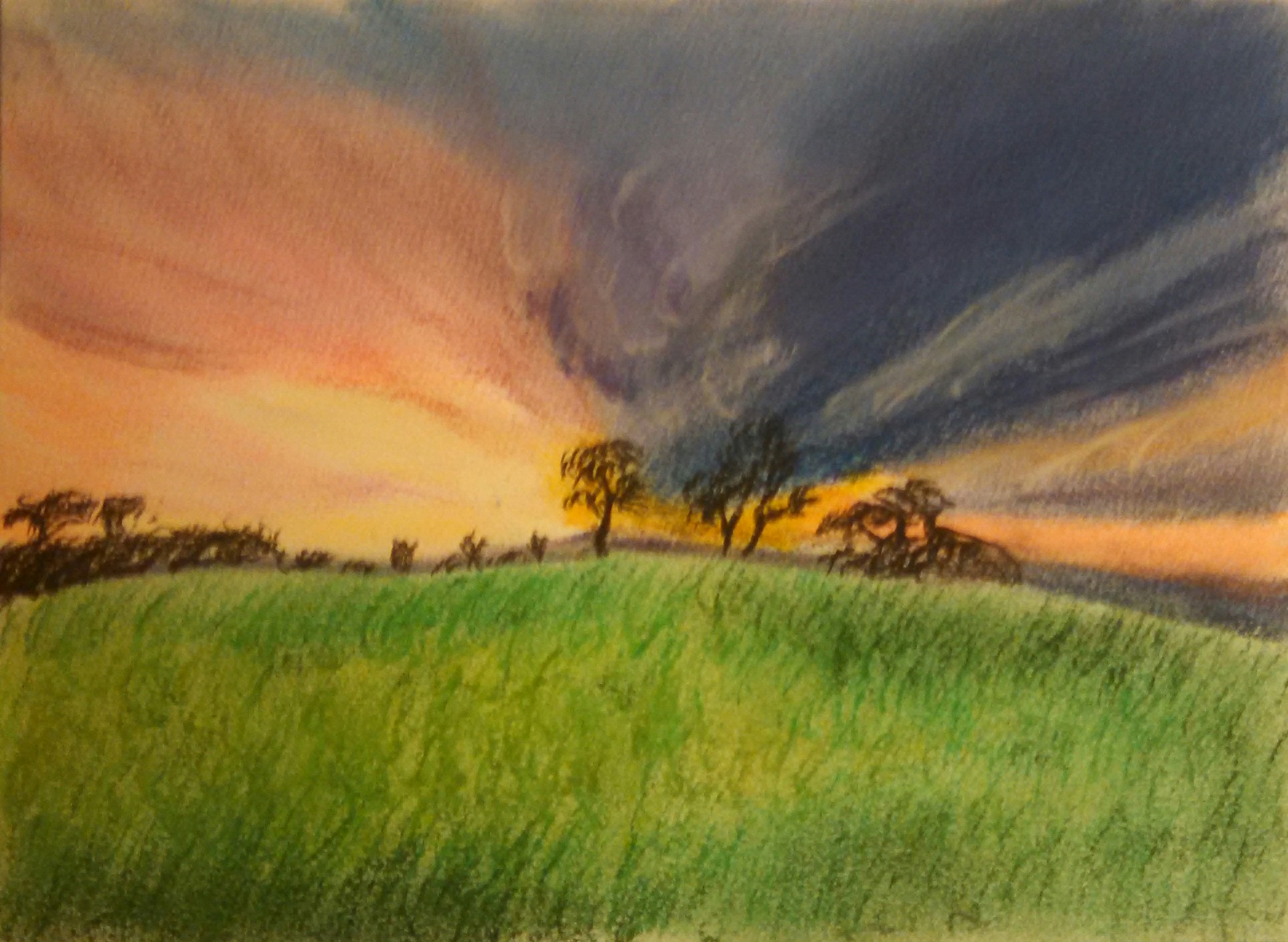 Anyways, it is a country with a lot of pastures, and one morning, the sun rose a brilliant purple, pink, orange, and yellow. These offset amazingly with the greens in the grass.