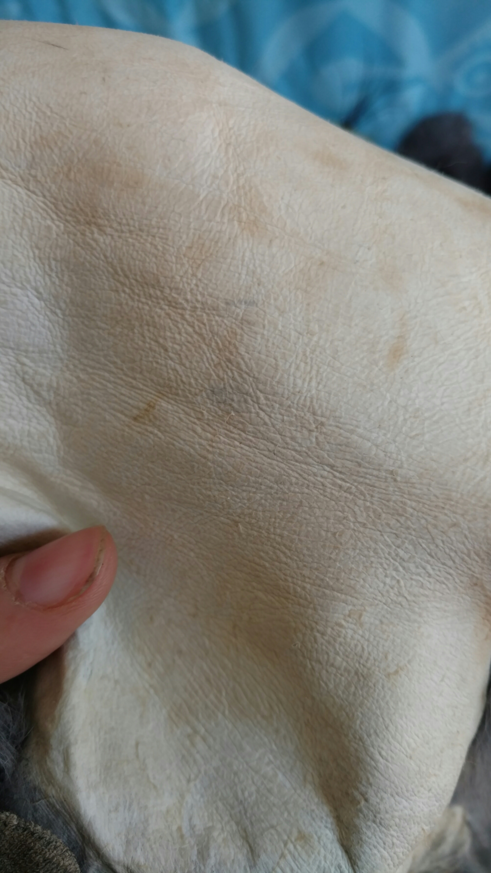 Once the skin was dry and slightly stiff, we began to stretch the skin until it is white. Working the leather side to a dull suede finish.