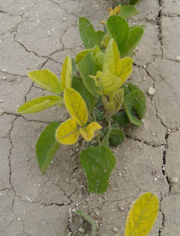 In Kansas, the soils are actually deficient in iron. This is a huge problem for plants, as they rely on iron for production of chlorophyll. Without adequate supply, upper leaves start turning yellow. If the situation is not improved, the plants yield poorly, and can even die. This is especially problematic in soybeans. What causes chlorosis is very complex, as iron interacts with many different nutrients, as well as moisture levels. However, high pH is almost always necessary.