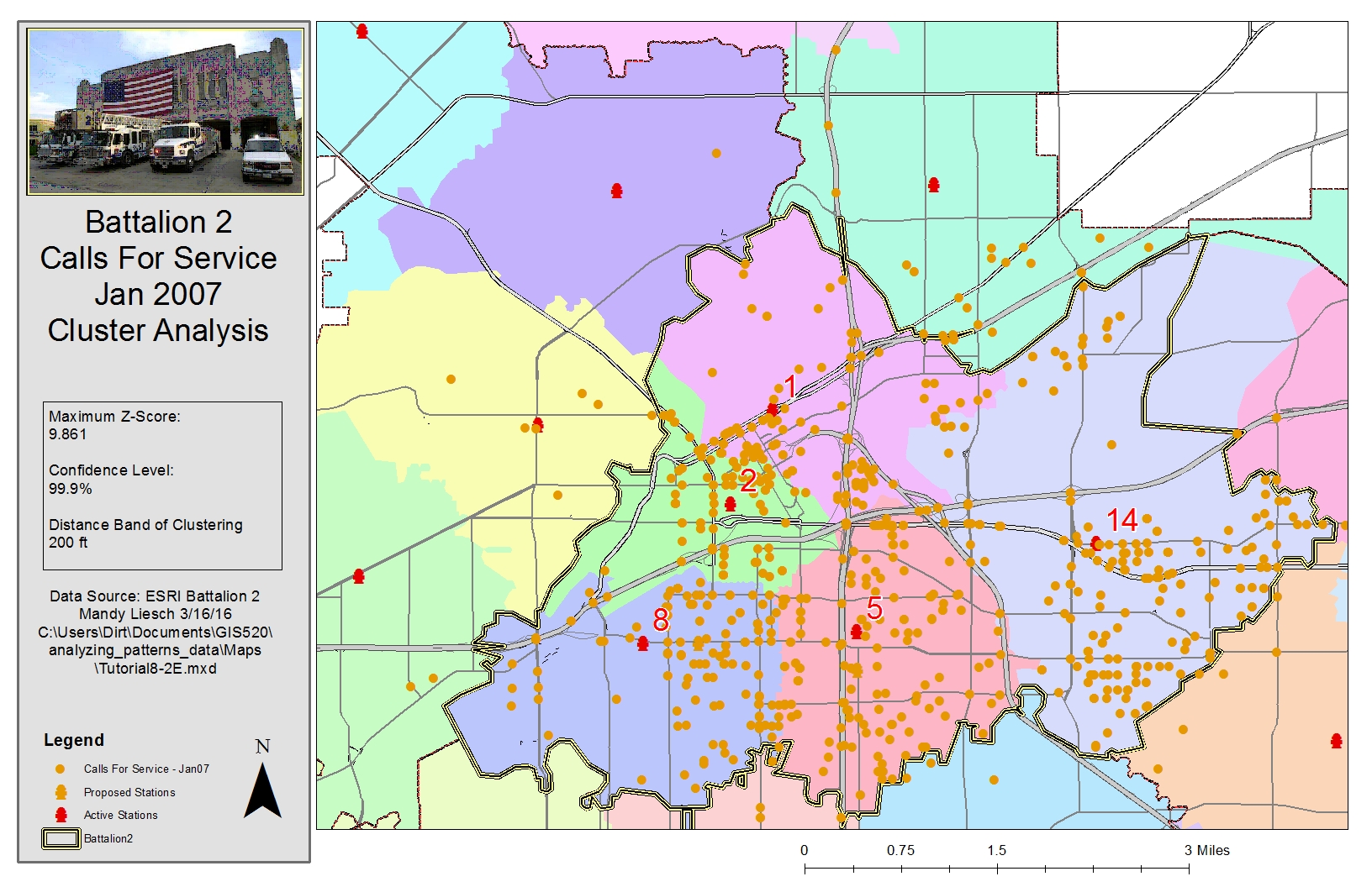 average nearest neighbor tool : This calculates an index based on how close features are located and compares that distance to an index for randomly distributed features. This assesses clustering by location only. The tool is used by inputting the feature class of interest (False incident types 700-745) and setting the area to a size similar to the dataset (area of battalion 2). This analysis used the definition query to highlight only incident types between which were false alarms.