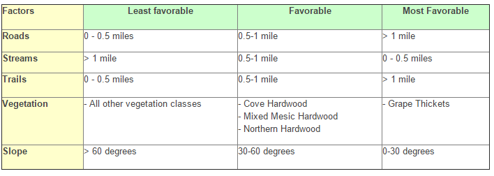 Suitability analysis or site selection can be performed via GIS analysis and determines the best locations for something dependent on applied criteria.Weighted suitability analysis allows one to answer questions that are impacted by many factors and assign varying weights to each of the factors. The result gives more information than binary analysis, as it ranks locations based on the suitability rather than giving only a suitable/not suitable result. We need to identify the problem (bear relocation), and break it down into smaller submodels. Then we determine which layers are important for determining bear habitat. Layers can be vector or raster data. For this problem, stream, trail, and road data were line vectors, vegetation was a polygon vector, and elevation was a raster dataset. Transformations that can happen to analyze data include changing vector data to raster data, calculating distances to features, and/or determining slope, aspect, etc. The last step, before performing the weighted overlay, is to reclassify each layer. This gives the layers a common scale (i.e. 1 to 5, 1 to 9, etc.) that will be preserved in the final overlay. Table 1 shows the selection factors, and the reclassification criteria on a 1 to 3 scale. Finally, the weight of each layer is assigned, the layers are combined in a weighted overlay, and the results are analyzed. See Fig. 1 for a graphical depiction of the model used to solve the bear exercise. The Procedure-Log can be found here.