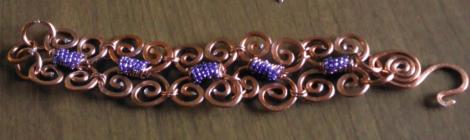I really like working with copper wire! This is a spiraled bracelet constructed in five different pieces. These pieces are wrapped in bronze wire, and overlain by sparkly blue beads.  The clasps […]